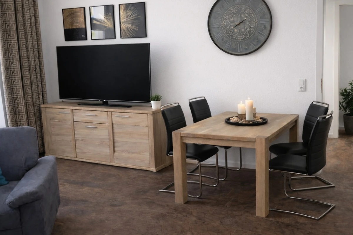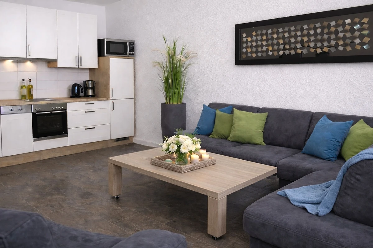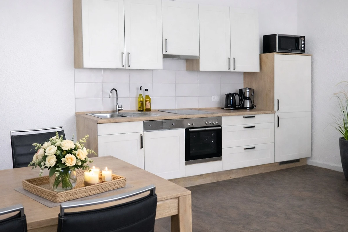 Die Wohnung besteht aus einem Wohnraum mit einer Essecke für 5 Personen, die exklusiv ausgestattete Küchenzeile enthält unter anderem eine Kaffeemaschine, ein Ceranfeld mit Backofen, Kühlschrank, Geschirrspülmaschine, Toaster, Geschirr und Gläser sind reichhaltig vorhanden.