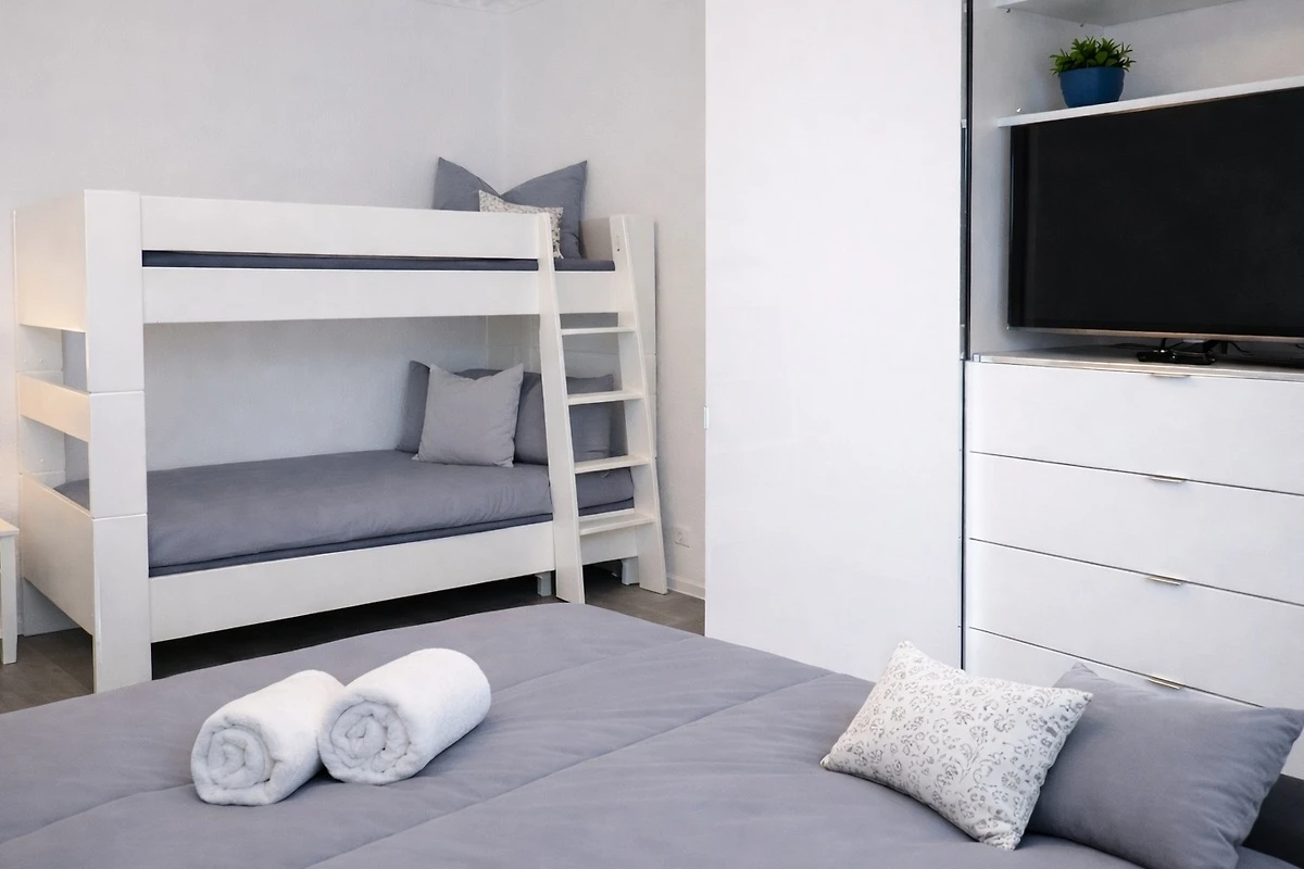Im Schlafzimmer befinden sich ein großes Boxspringbett, ein Etagenbett und ein Schrank mit integriertem Flachbildfernseher (Smart-TV)