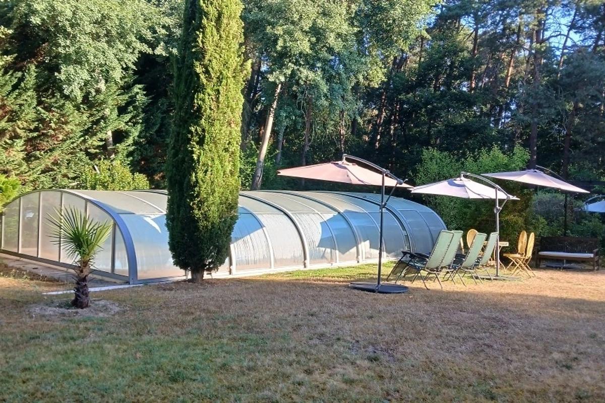 Das Haus befindet sich in einem 3000m2 großen Grundstück, der überdachte Pool ist geöffnet von 13 Uhr bis 19 Uhr von Mitte April bis Ende Oktober.