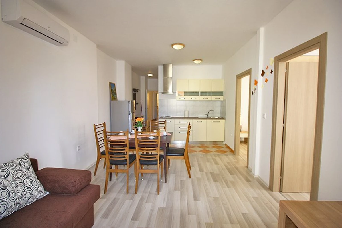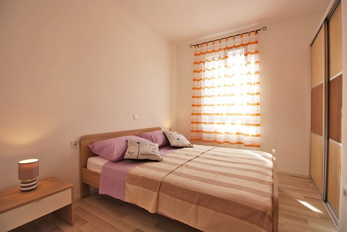 Die Wohnung in im ersten Stock und besteht aus Flur, Küche mit Esszimmer und ein Wohnzimmer mit Sat-TV, Wi-Fi, Klimaanlage , Bad mit Dusche, zwei Schlafzimmer, beide mit Doppelbetten, Schlafsofa im Wohnzimmer. Beide Schlafzimmer hat einen Meerblick und aus dem Wohnzimmer gibt es einen schönen Blick auf das Zentrum. Der private Parkplatz ist nur 50 m entfernt.