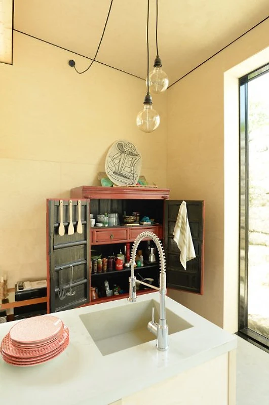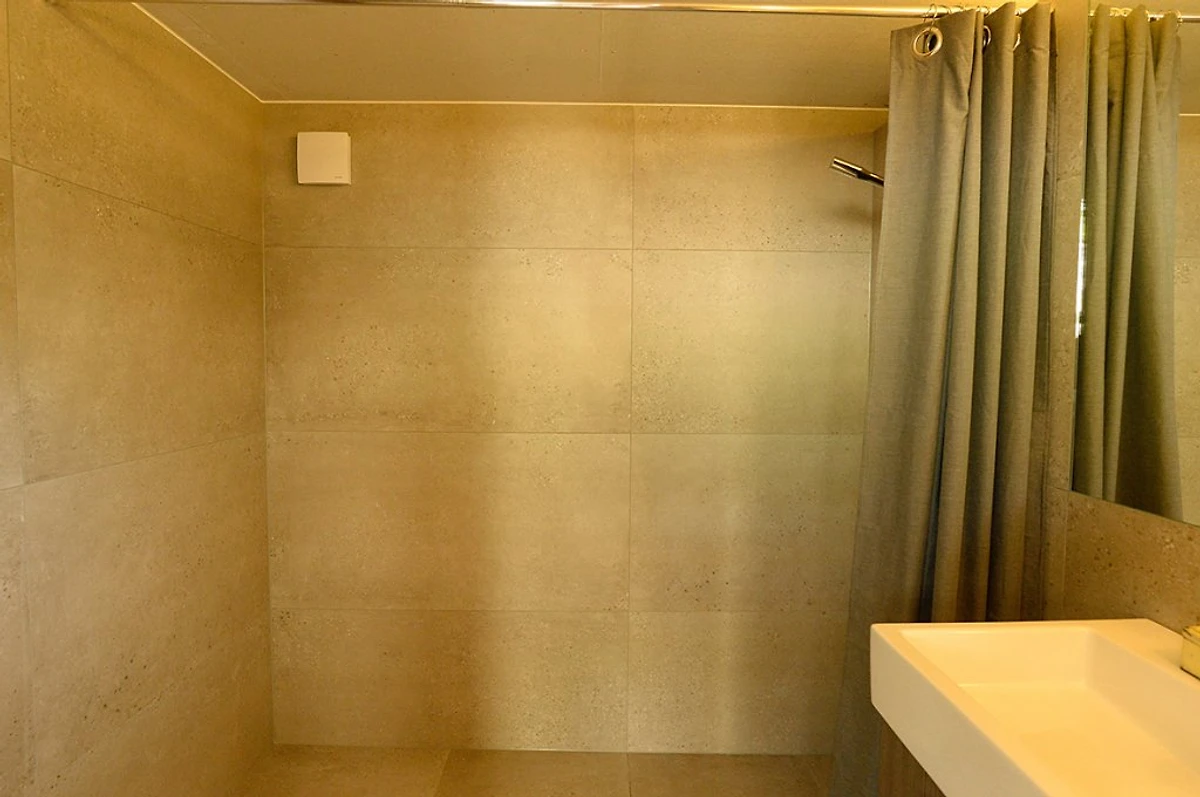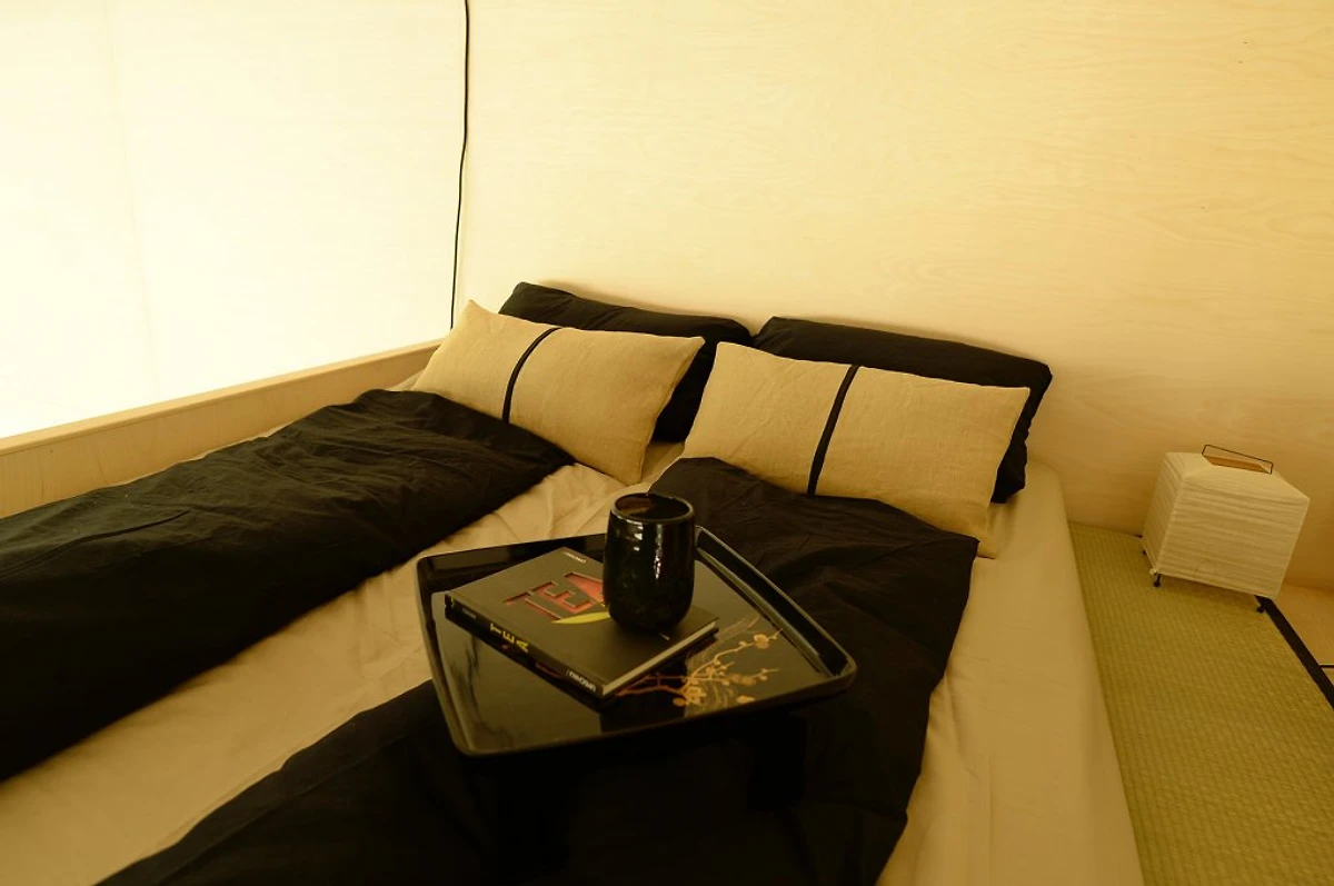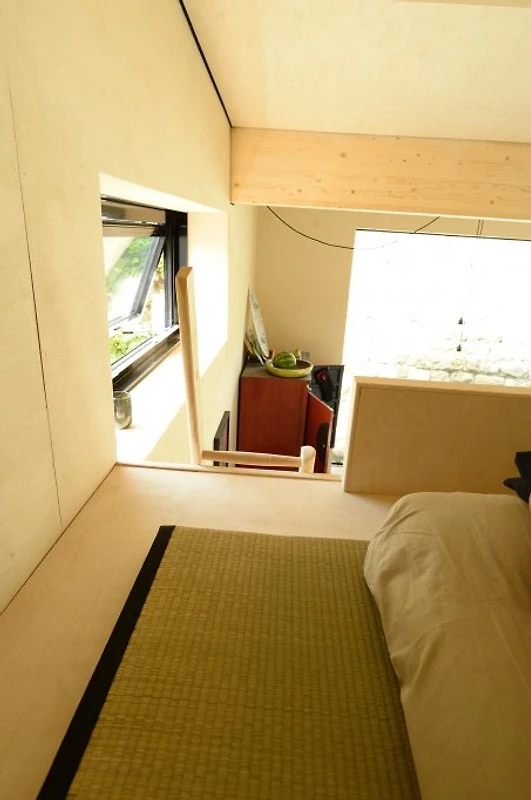 Die Küchenspüle wurde aus Beton gegossen, Auf der Schlafebene (2,70 m Höhe) schläft man auf Biomatrazen. Ebenerdig gibt es eine Liege- und Relaxfläche auf japanischen und biologischen Tatamimatten mit Futon. Hier ist Platz für eine 3. Person. Das Bad wurde mit schönen Badmöbeln ausgestattet.