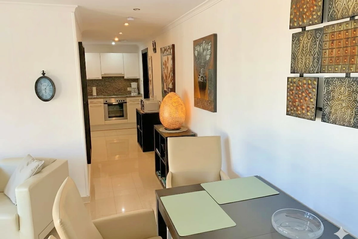 Vom abgeschlossenen Autoabstellplatz gelangen Sie über einige Stufen zum Garten mit Rasenfläche und Palmen. Eine Gartensitzgruppe sowie eine Theke mit Stühlen bieten unterschiedliche Blickmöglichkeiten. Zur Kühlung Ihrer Speisen und Getränken steht Ihnen in dem überdachten Pavillon ein Kühlschrank zur Verfügung, der vorhandene Gas-Grill kann jedoch aus Sicherheitsgründen nicht benutzt werden. Für Sie steht jedoch ein portabler Holzkohlegrill zur Verfügung.