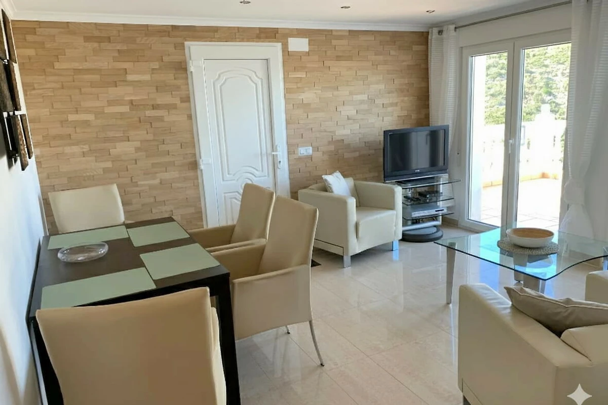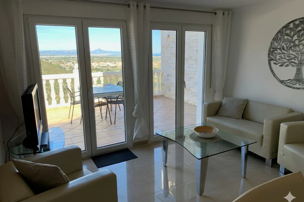 Die herrliche Aussicht begleitet Sie auch im Inneren des Hauses. Vom Wohnzimmer aus, kann man nicht nur das Meer sehen, sondern hat auch einen schönen Blick auf das Naturschutzgebiet des Montgos. Alle Terrassen haben Sicht auf das Meer. Ein Schlafzimmer und das Badezimmer haben direkte Sicht auf das Meer, das andere Schlafzimmer hat eine Terrasse, von welcher man auf das Meer sieht.