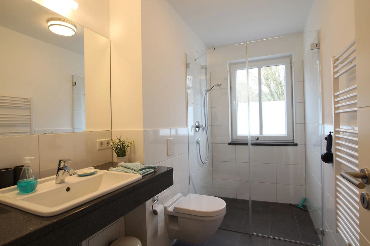 Auf den Balkon können Sie sowohl vom Wohnzimmer als auch vom Schlafzimmer gelangen. Hier warten Balkonmöbel und ein Strandkorb auf die Gäste. Die Fenster sind mit Fliegengitter versehen. Das Duschbad ist hell und sonnig durch das Fenster. IM EG des Hauses finden Sie einen Waschraum, ausgestattet mit einer Waschmaschine und ein Trockner, welche auf Münzbasis nutzbar sind.