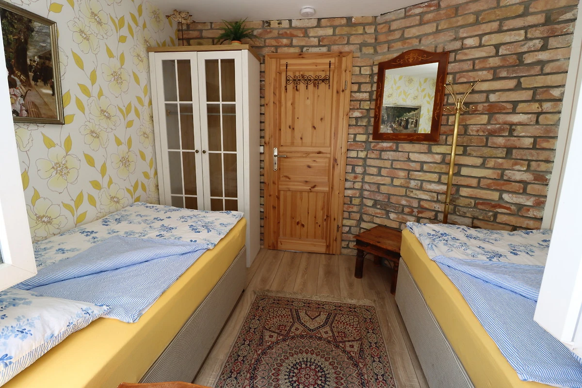 Es gibt 3 gemütliche Doppelzimmer mit 6 Boxspring-Einzelbetten,