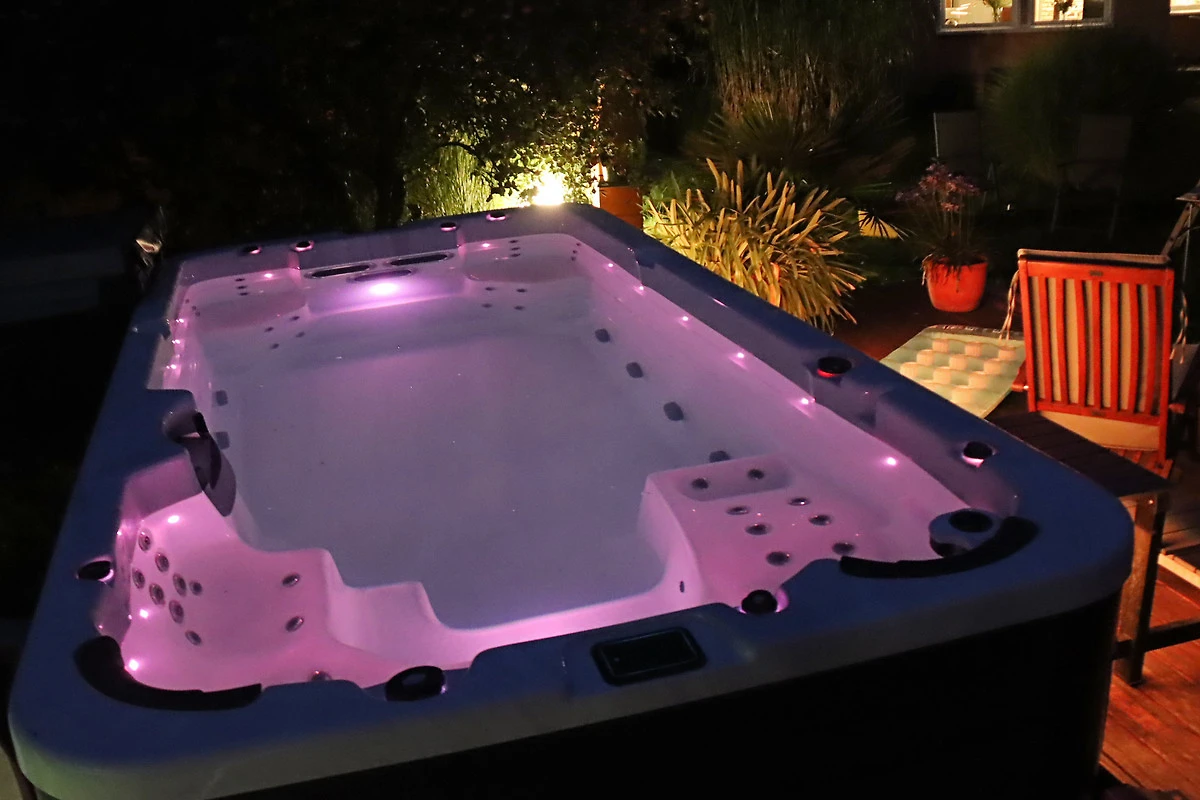 Alle Pollfunktionen mit Heizung ( bis 34 Grad ), 6 Whirlpoolplätze, Gegenstromanlge und das stimmungsvolle bunte LED- Unterwassernachtlicht können für 90 Euro pro Übernachtung gebucht werden.