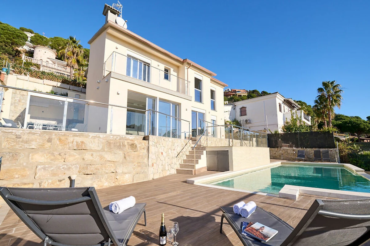 Moderne mediterrane Ferienvilla mit 2 Wohnungen an der Costa Brava, in der Urbanisation Serra Brava bei Lloret de Mar in Spanien, oberhalb der malerischen Badebucht Cala Canyelles. Das Anwesen beeindruckt mit einem fantastischen Panoramablick auf das Mittelmeer und einem großen, privaten Schwimmbad.