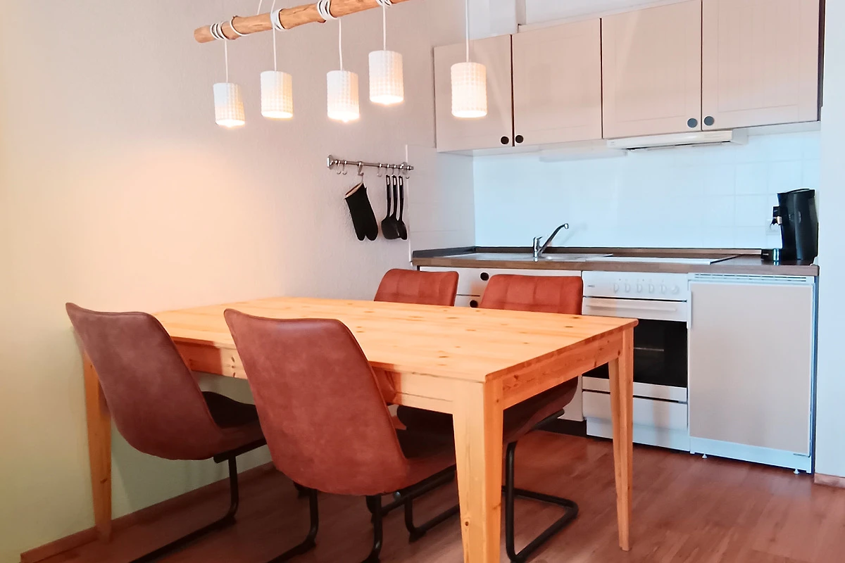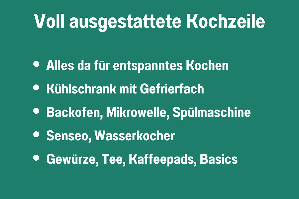 Herd, Backofen, Spülmaschine, Mikrowelle, Kühlschrank mit Gefrierfach, Senseo-Padmaschine, Wasserkocher, Toaster, Handmixer, Eierkocher. Vorrat an Kaffeepads, Spülmaschinentabs, Spülmittel und Grundgewürzen.