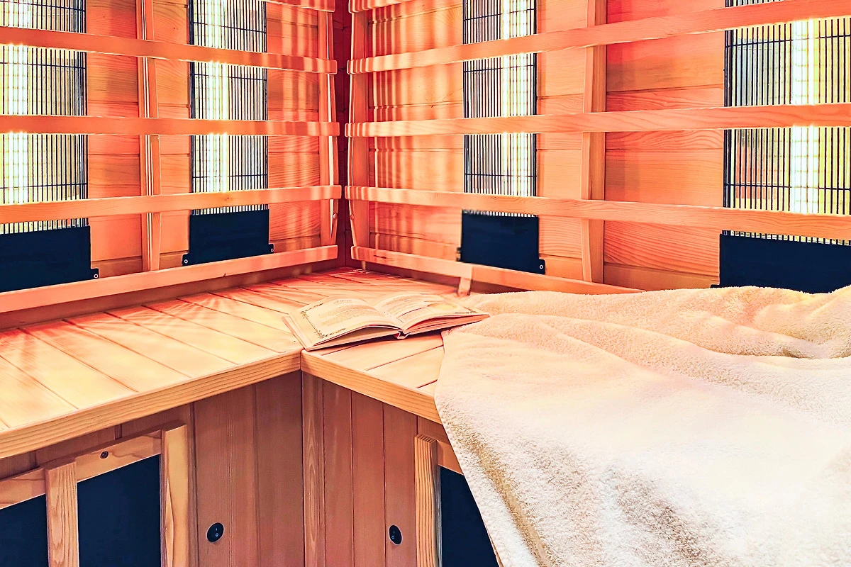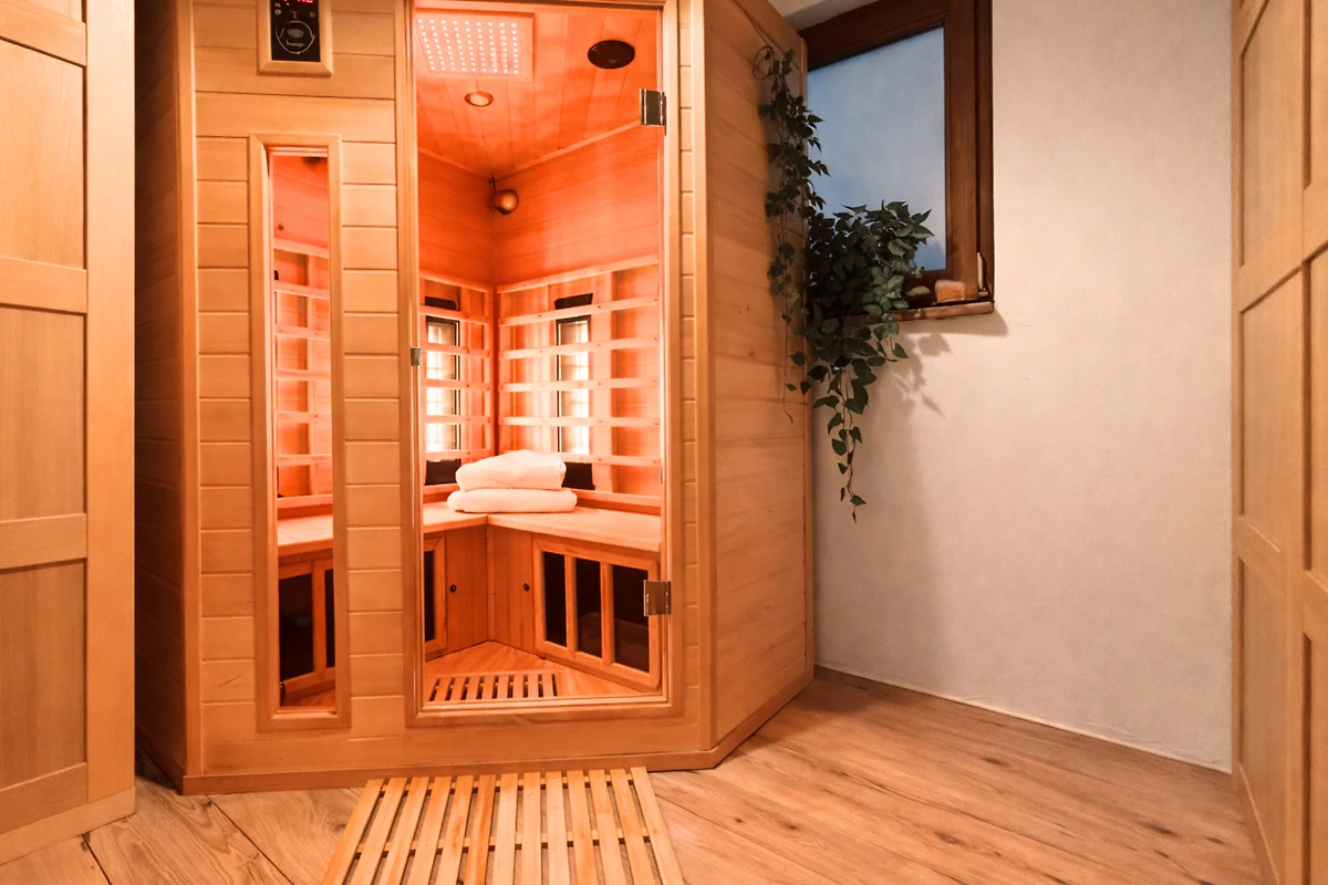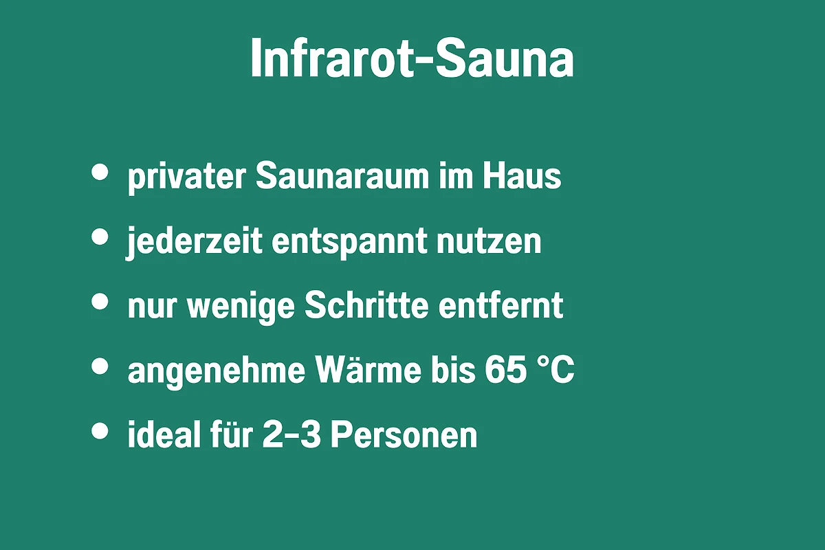Infrarotsaunaraum unter der Wohnung (ca. 10 m über gemeinsamen Hausflur, private Nutzung), Infrarot-Sauna mit Lichtsteuerung, sanfte Wärme max. 65 °C.
