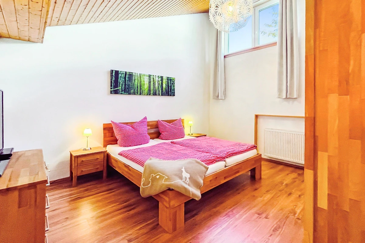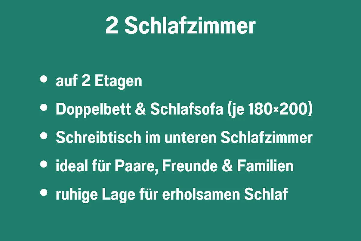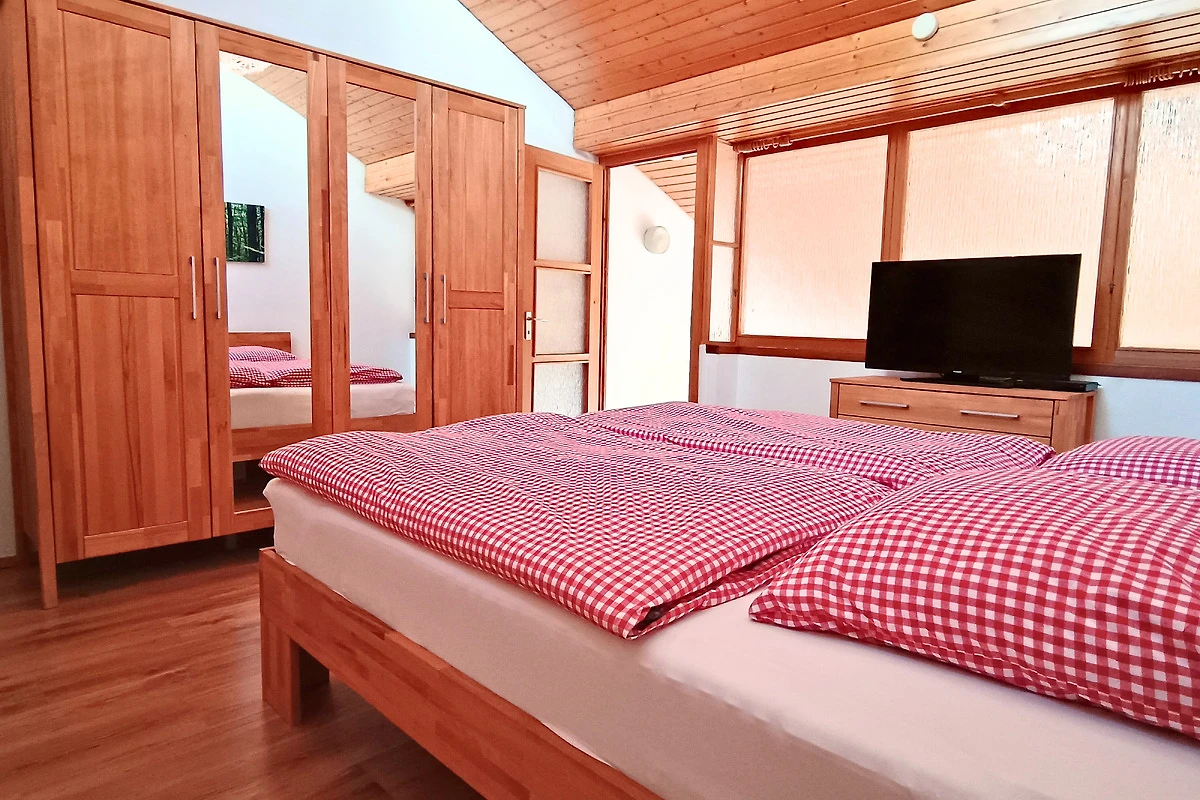 Schlafzimmer 1 (Dachgeschoss): Doppelbett 180 × 200 cm, Verdunkelung, Kleiderschrank, Fernseher. Über Treppe vom Wohnzimmer erreichbar, durch Tür abgetrennt.