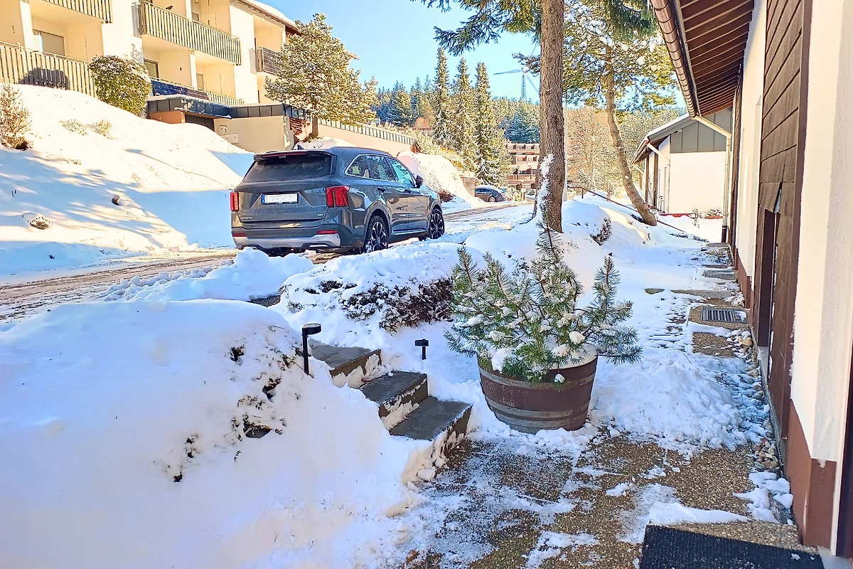 PKW-Stellplatz direkt am Haus; im Winter Parken im geräumten Bereich an der Straßeneinmündung.