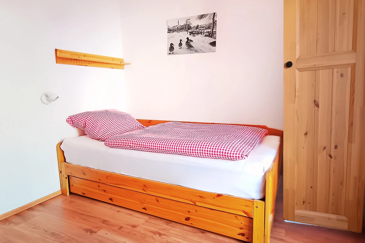 Schlafzimmer 2 (Erdgeschoss): Daybed 90 × 200 cm / ausziehbar 180 × 200 cm, ruhiger Rückzugsraum ohne TV. Vom Schlafzimmer 1 durch Flur, Wohn- & Essbereich und Treppe getrennt – nicht direkt nebeneinander.