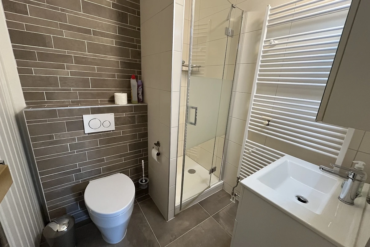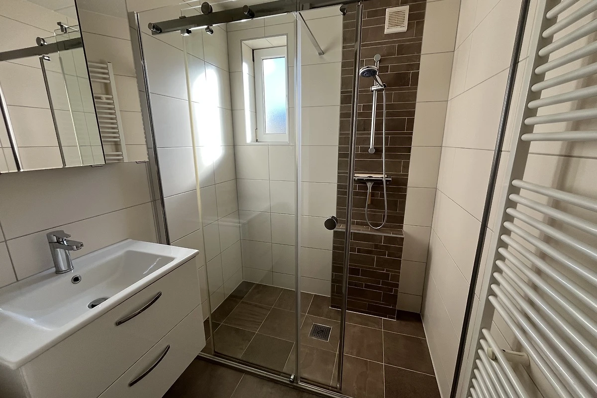 1 Luxusbad mit begehbarer Dusche (170x90cm), Fenster, Waschtisch, Wärmehandtuchhalter