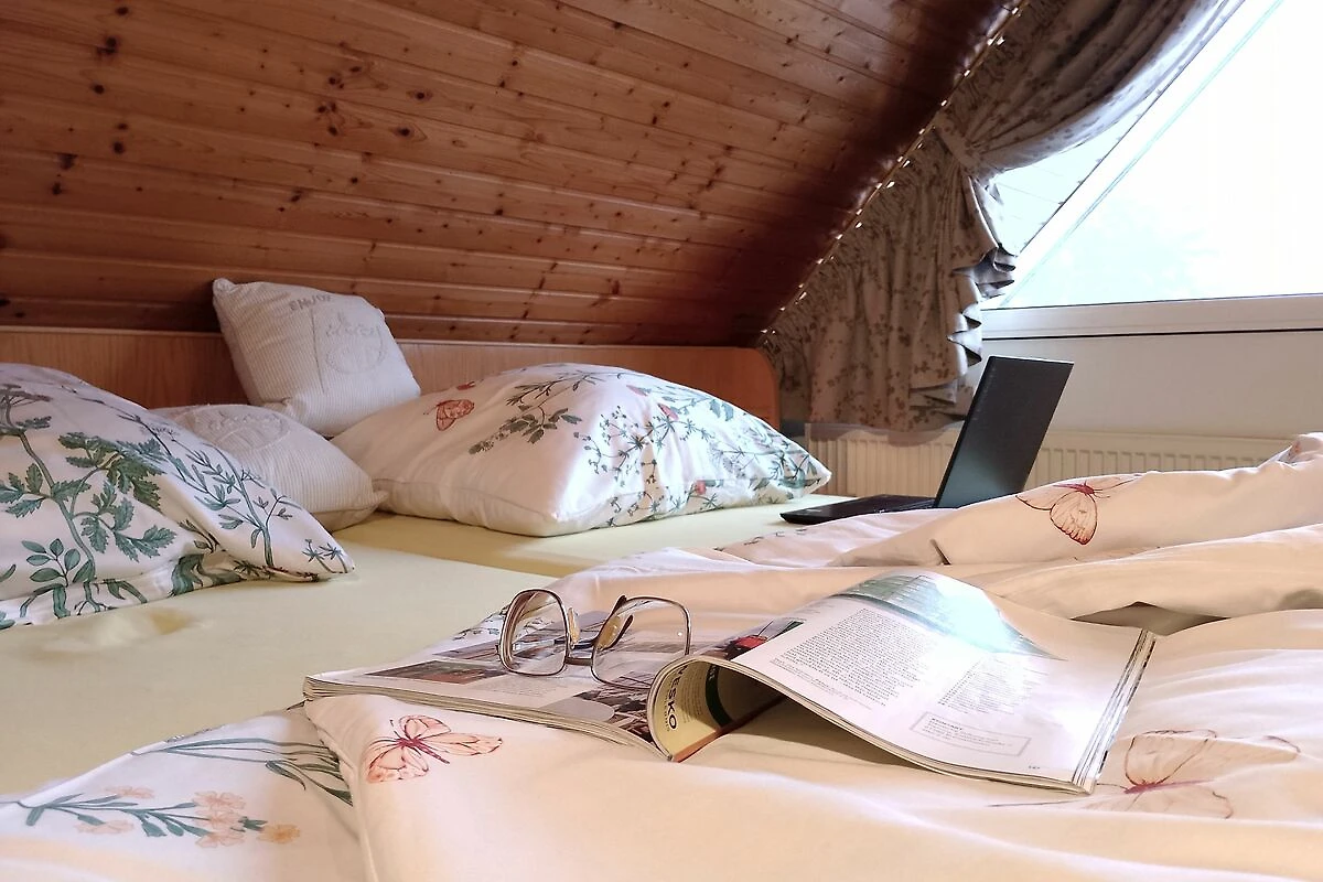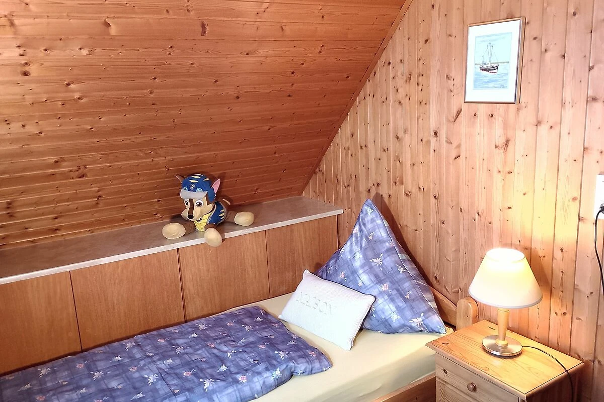 Im Obergeschoss befindet sich ein Schlafzimmer mit Doppelbett und Balkon und ein Schlafzimmer mit zwei
