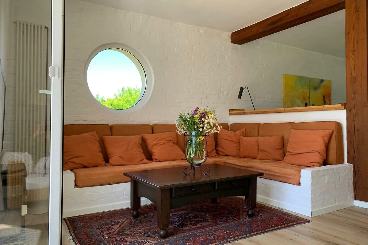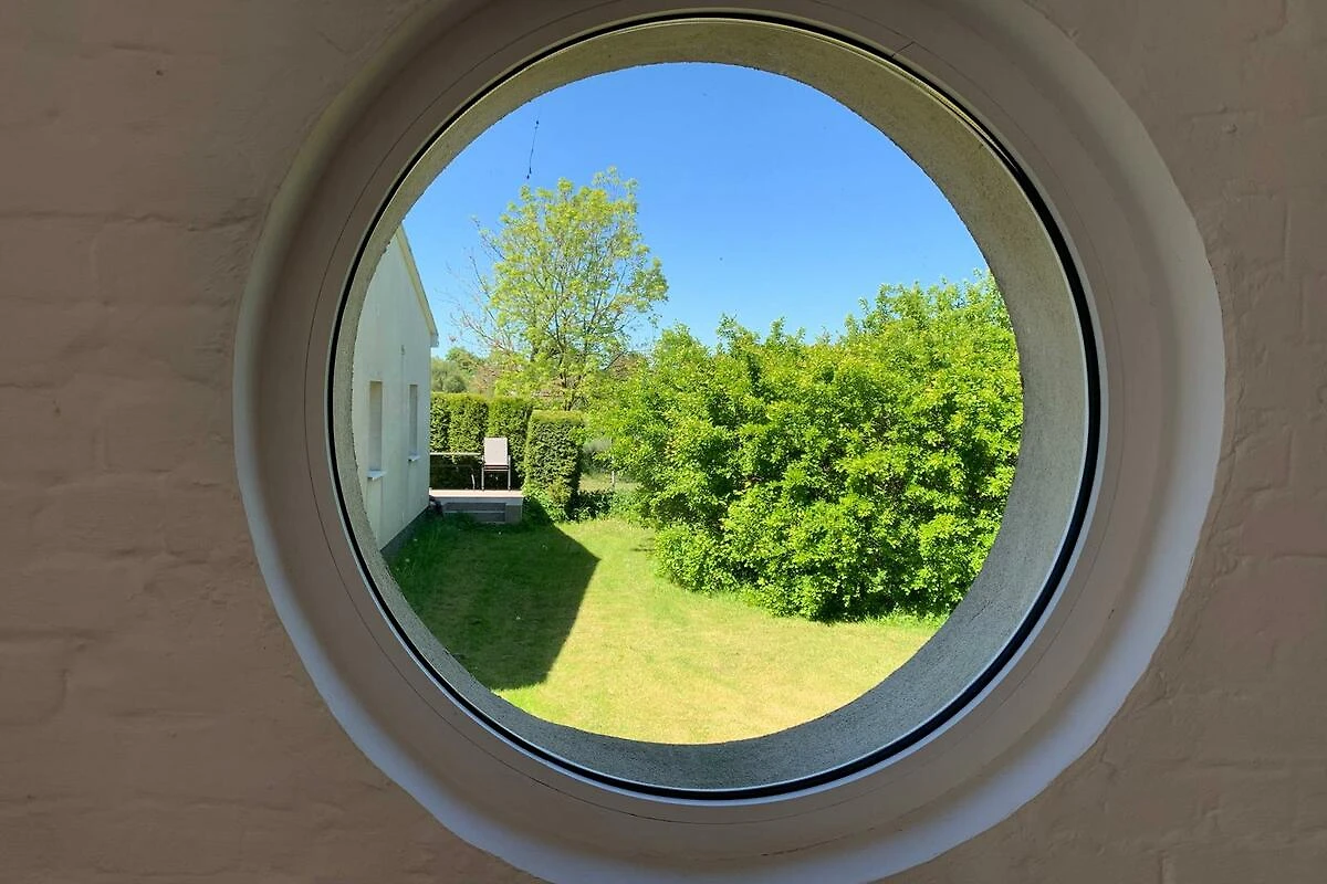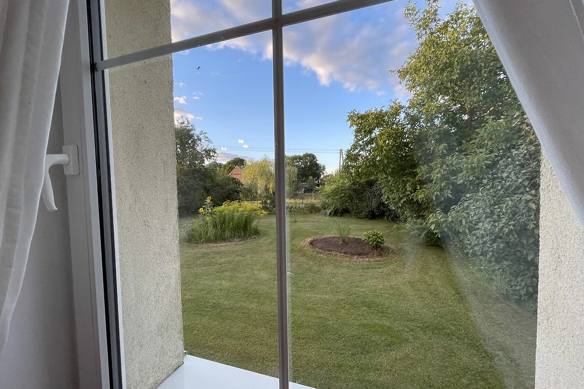 Der Blick durch das runde Fenster im großzügig gestalteten Wohnbereich bietet einen weiten Ausblick über die traumhafte pommersche Landschaft rund um Rozwarowo.