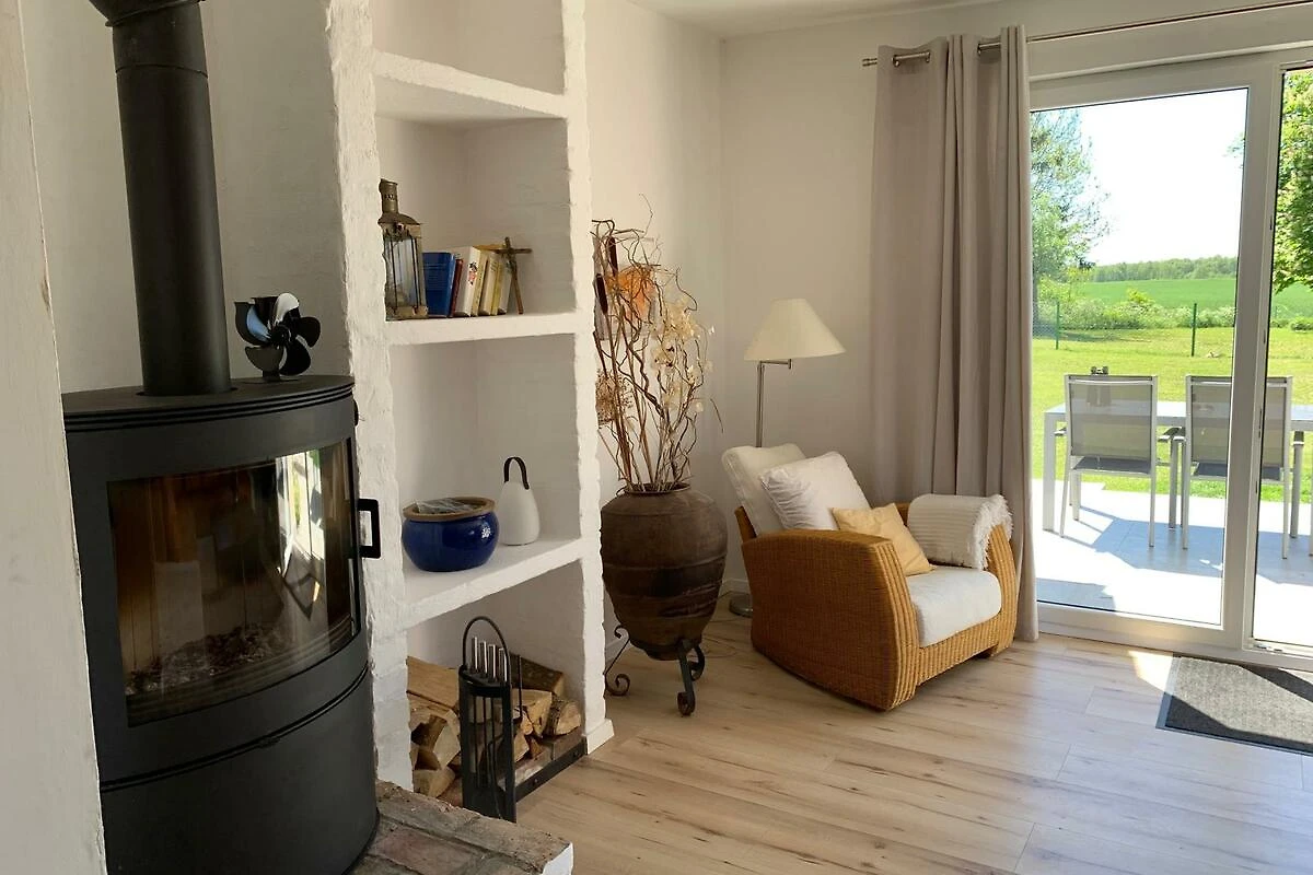Ein wunderschönes Ferienhaus, nahe zum Oderhaff, 19 km zur Ostsee, liebevoll gestaltet , in dem es viel Freude macht zu verweilen, auch wenn das Wetter einmal nicht so mitspielen sollte. Der mediterrane Stiel der Innenräume verleiht dem Haus seinen besonderen Charme. Abende am großen Kaminofen bleiben den Gästen in besonderer Erinnerung. Kinder finden im weiten Umfeld viele Möglichkeiten sich selber zu beschäftigen. Angeln, Ballspiele, Fahrrad fahren, schwimmen, segeln, wandern oder auch nur verweilen und entspannen sind nur einige der Möglichkeiten die die Gästen im nahen und näheren Umfeld nutzen kö 1. Geschoss findet man das großzügig angelegte Bad und zwei Schlafzimmer sowie eine kleine Lese- oder auch Fernsehecke.
