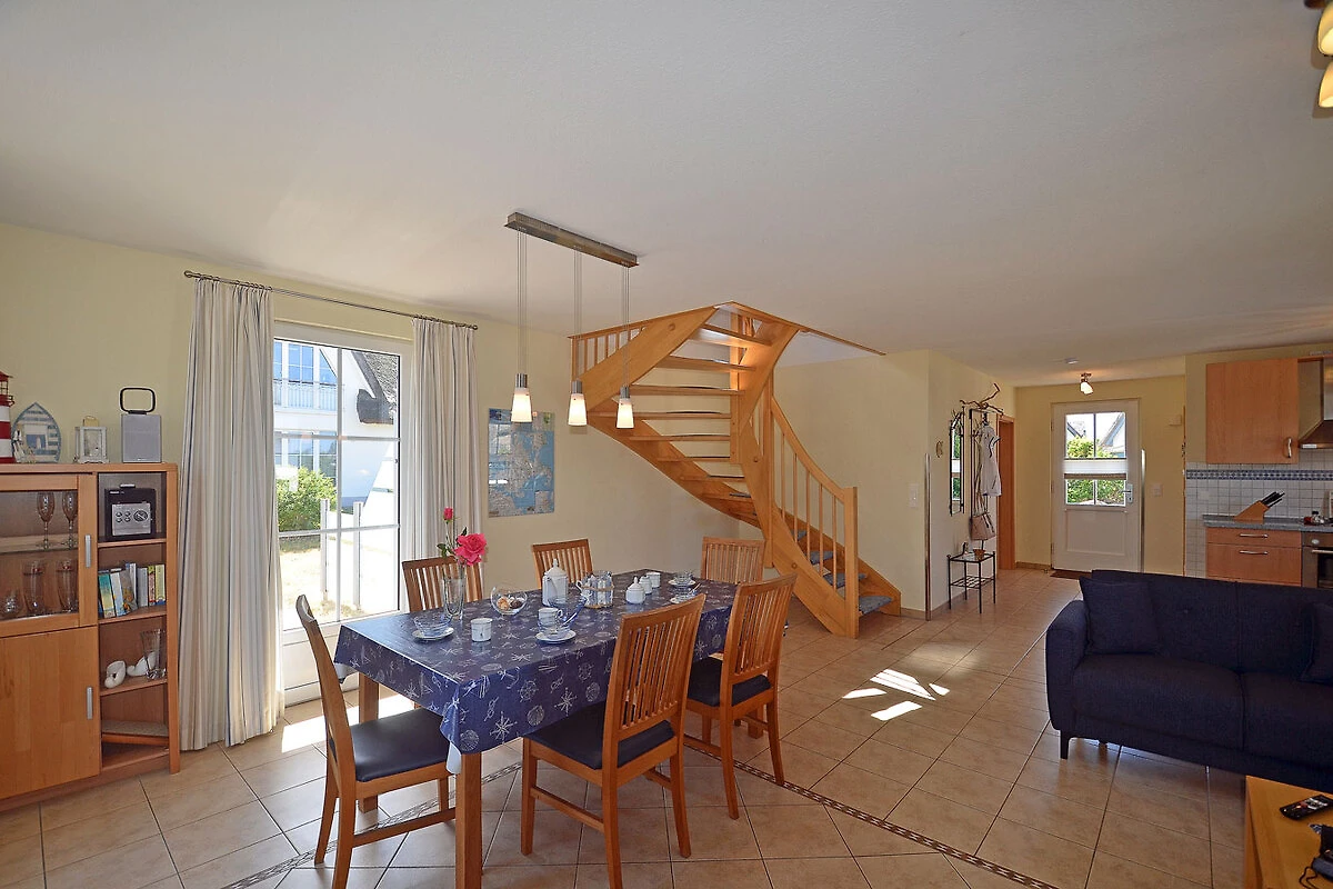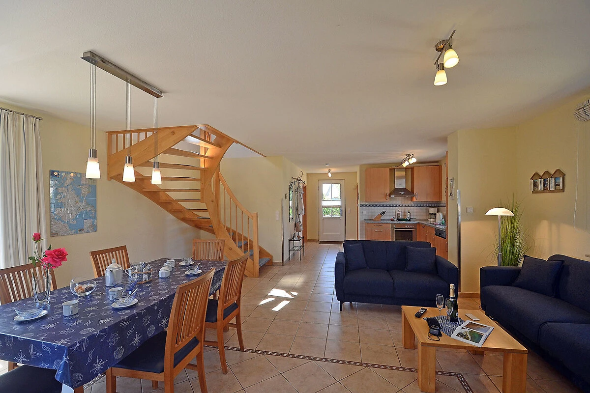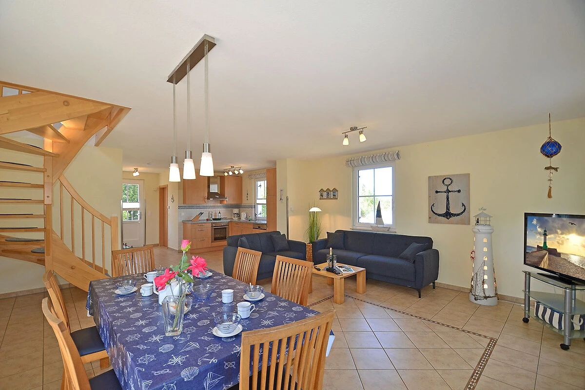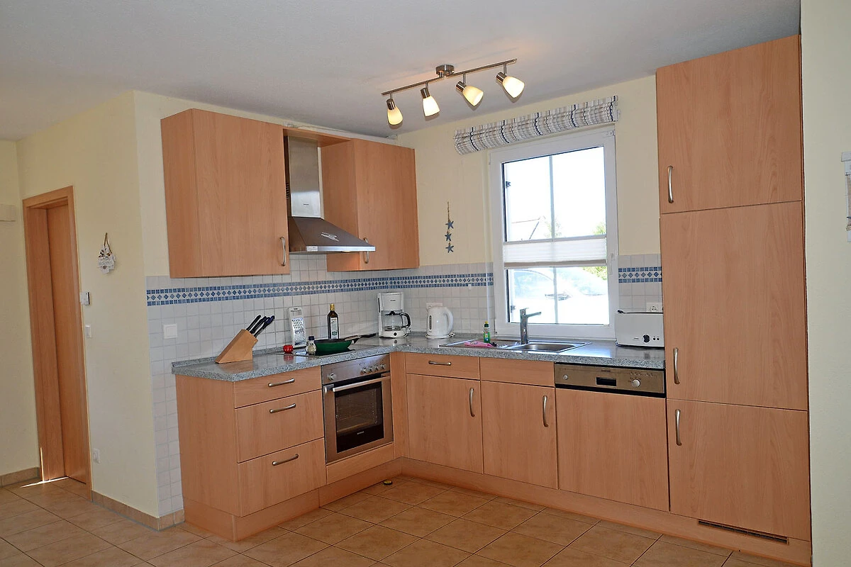 Erdgeschoss: großzügiger Wohn- Essbereich mit Fußbodenheizung und Kamin, gemütliche Couch mit Schlaffunktion, TV/ Sat (Flatscreen), Radio/ CD, offene komplett ausgestattete Einbauküche mit 4- Plattenherd (Ceranfeld), Backofen, Kühlschrank mit kleinem Gefrierfach, Geschirrspüler und diversen Elektrogeräten, Bad mit Dusche und WC,