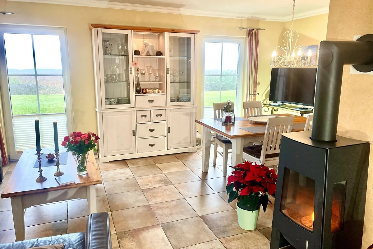 Exklusive Ferienunterkunft in unvergleichlicher 1A-Lage im Norden auf der wunderschönen Insel Rügen. Die Einrichtung dieser Unterkunft überzeugt mit einer einzigartige Kombination aus Luxus und Charme. Die hellen, lichtdurchfluteten Zimmer im Ferienhaus laden zum Wohlfühlen und Entspannen ein. Der Wohnbereich des Domizils ist mit Couch- und Sitzgarnitur aus Echtleder, einem Kamin und HD Flachbildschirm ausgestattet. Für Hobbyköche lässt die Ausstattung der Küchekeine Wünsche offen. Neben diversen Kochtöpfen und Pfannen, steht hier Geschirr für jeden Anlass bereit. Von der angrenzenden Terrasse können Sie den unvergleichen Wasseerblick genießen.