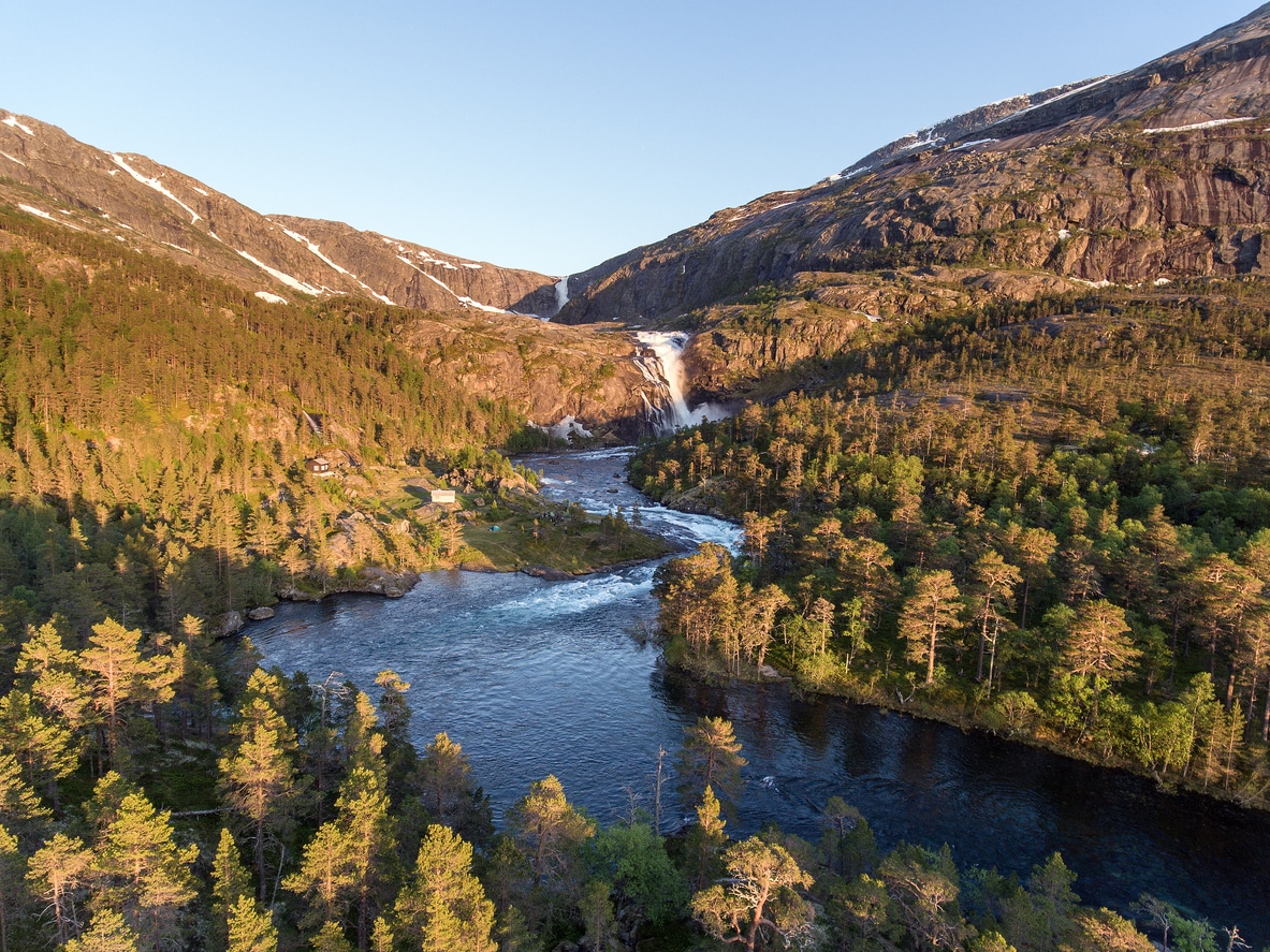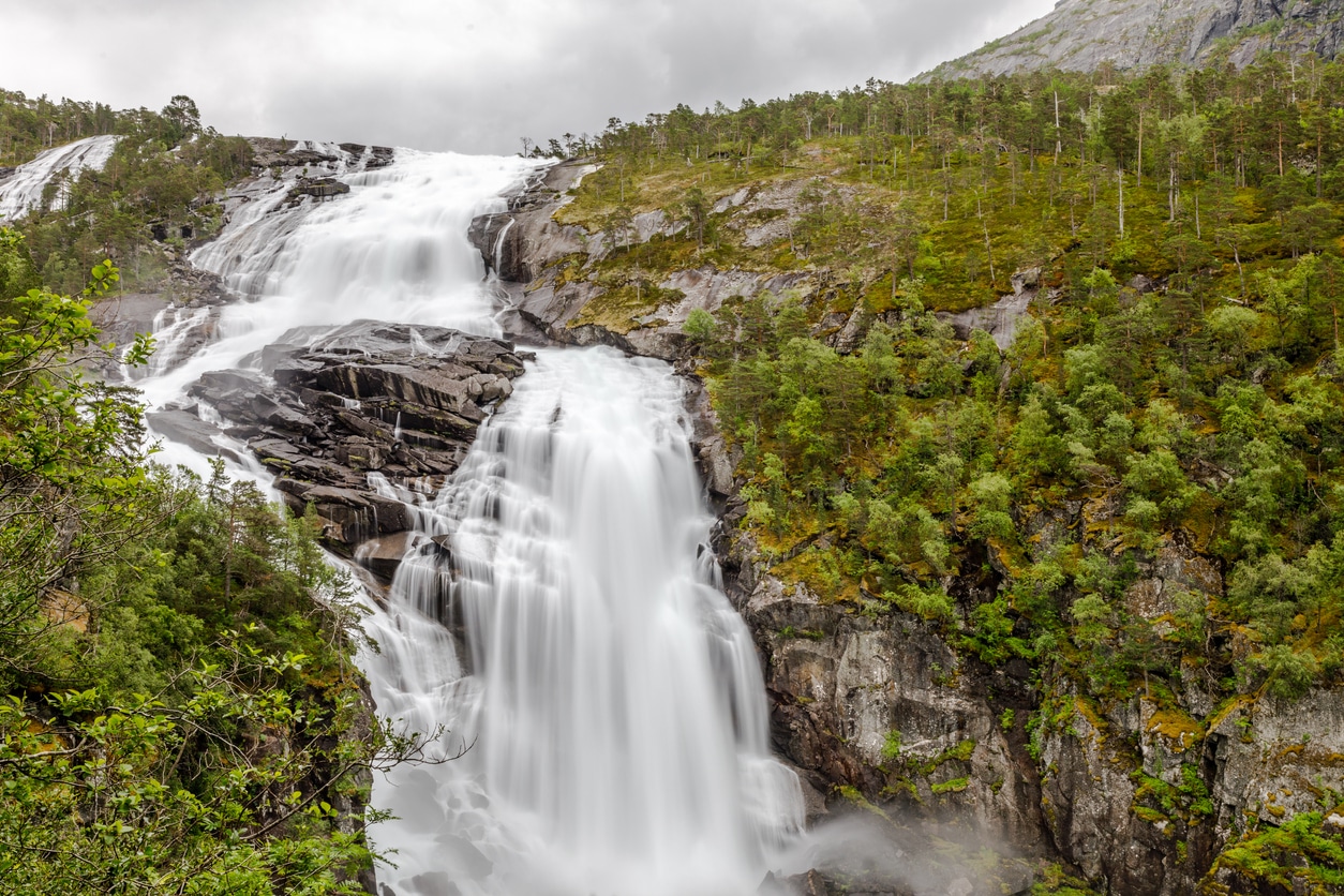 Überqueren Sie die Brücke und folgen Sie dem mit einem roten T gekennzeichneten Wanderweg. Nach eineinhalb Kilometern kommen Sie zu einem Wasserkraftwerk, neben dem der erste der drei Wasserfälle, der Tveitafossen, mit einer Fallhöhe von 103 Metern in den Kinso stürzt. Hinter dem Kraftwerk führt ein markierter Pfad entlang eines Wasserrohrs steil nach oben zu einem Staubecken und durch einen Wald zum Nyastølfossen, wo das Wasser aus 200 Metern in die Tiefe donnert. Der Weg wird nun felsiger und Sie kommen an kleinen Bachläufen vorbei.