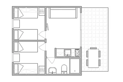 Parterre: (Esszimmer(Esstisch, Balkon oder Terrasse), offene Küche(Kochherd, Kaffeemaschine, Mikrowelle, Kühlschrank), Schlafzimmer(Doppelbett), Schlafzimmer(Etagenbett)