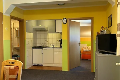 Parterre: (Schlafzimmer(, , Doppelbett, Heizung), Badezimmer(, Toilette, Dusche, Waschbecken, Heizung)) , , , Wohn/Esszimmer(, TV, TV, Esstisch, Heizung)