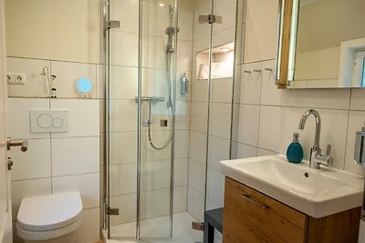 Unsere neuste Wohnung! Sie liegt hofmittig direkt neben dem Hofladen. Liebevoll im modernen Landhausstil eingerichtet mit Fussbodenheizung, ebenerdiger Glasdusche, grossem Holzbalk...