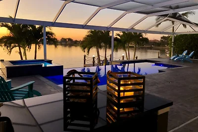 Moderne Villa im Südwesten von Cape Coral, Salzwasser-Infinitypool + Whirlpool, Westausrichtung, Solaranlage und Photovoltaik. 3 Schlafzimmer mit Kingsize-Betten, 3 Badezimmer.
