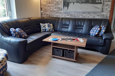 Unser frisch renoviertes Haus bietet auf 120 qm Wohnfläche ein behagliches Wohnzimmer mit Kaminofen und ein grosses Esszimmer mit einer gemütlichen Recamiere.