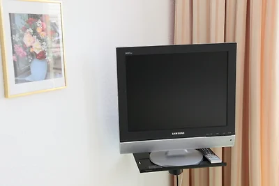 Offene Küche(Kochplatte(2 Kochplatten, elektrisch), Wasserkocher, Toaster, Kaffeemaschine, Kühl-/Gefrierkombination), Wohn-/Schlafzimmer(Doppelbett, TV(Satellit), Esstisch, Radio)