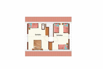 90 m² großes lichtdurchflutetes Ferienhaus auf zwei Ebenen, großzügiges Wohnzimmer mit SAT-TV, Essbereich und komplett ausgestatteter Küche, 2 Schlafzimmer, Dusche und WC.