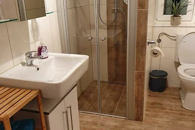 In der 1. Etage: (Wohnküche(TV, Esstisch, Sitzecke, Wasserkocher, Kochherd(4 Kochplatten), Kaffeemaschine, Backofen, Kühl-/Gefrierkombination), Schlafzimmer(Doppelbett)