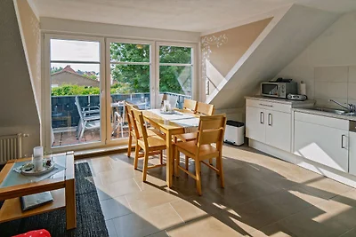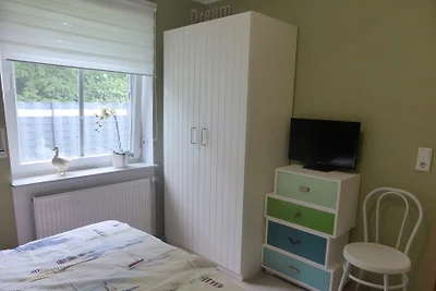 Strandnahe (800 m zum Hafen), neuw. Ferienwohnung. Küche m. Spülmaschine und DolceGusto Kapselautomat. Großer Garten, Parkplatz direkt vor dem Haus. max. 4 Pers., Stresslesssessel