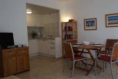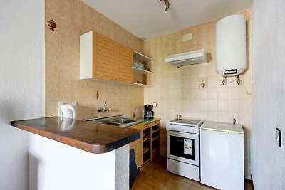 Wohnzimmer(Doppelschlafcouch, TV(Satellit), Esstisch, Klimaanlage), offene Küche(Kochplatte(Ceranfeld)