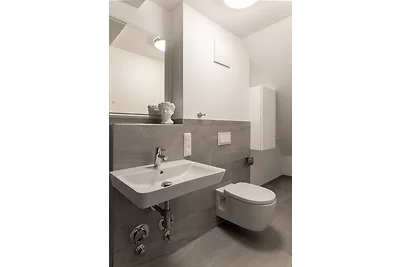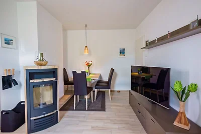 nachhaltige Fewo Wolken in zentraler Lage. Sie hat zwei Schlafzimmer, ein modernes Bad, einen Kaminofen und eine Terrasse.