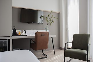 Luxuriöses Hotelzimmer für 4 Personen im De Boshoek auf der Veluwe, mit Klimaanlage, Nespresso-Maschine und Blick auf die Wiesen. Buchen Sie Ihren nachhaltigen Urlaub!