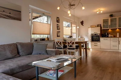 Helle, maritim eingerichtete Ferienwohnung mit Südbalkon, gelegen im Erdgeschoss eines Mehrfamilienhauses, bietet den Gästen einen gemütlichen Heimathafen in der Ferne.