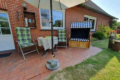 Ferienwohnung inmitten der ostfriesischen Natur mit gross begrüntem Grundstück. Ruhe und Erholung pur. Terrasse mit Markise, Gartenmöbeln und Strandkorb.