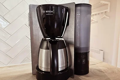 Parterre: (Wohnzimmer(TV(Flatscreen), Esstisch(6 Personen), Ofen, DVD-Spieler, Stereoanlage), Küche(Toaster, Kochherd(Gas), 2x Kaffeemaschine(cups, Filter)