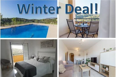 Luxuriöse 2-Zimmer-Wohnung in Mijas Costa, Spanien, mit Bergblick in Strandnähe, bietet Platz für 4 Personen.